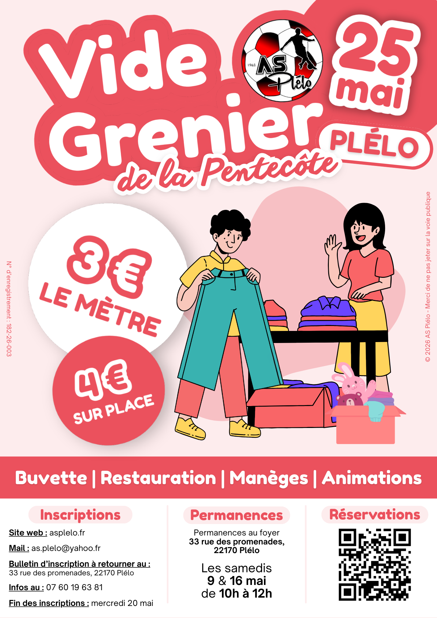 Ce vide-grenier est réservé aux particuliers souhaitant vendre ou échanger des objets mobiliers usagés, dans la limite de deux participations par an dans le département des Côtes-d'Armor. Le non-respect de cette limite pourra entraîner des poursuites judiciaires (art. L. 324-9 du Code du travail - travail dissimulé).